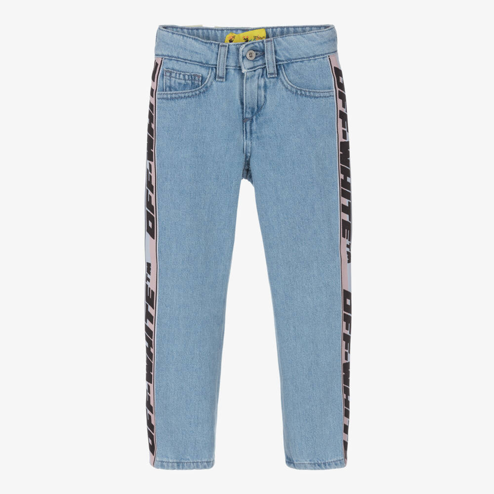 A pair of light blue denim jeans for girls by Italian luxury fashion label Off-White. For a truly signature finish, these versatile bottoms are trimmed with Industrial logo tape on the legs in pink and off white. With five-pocket styling, they have a yellow branded patch on the back featuring the distinctive Ow logo. They fasten with a branded button and zip and are fitted with an adjustable waistband.