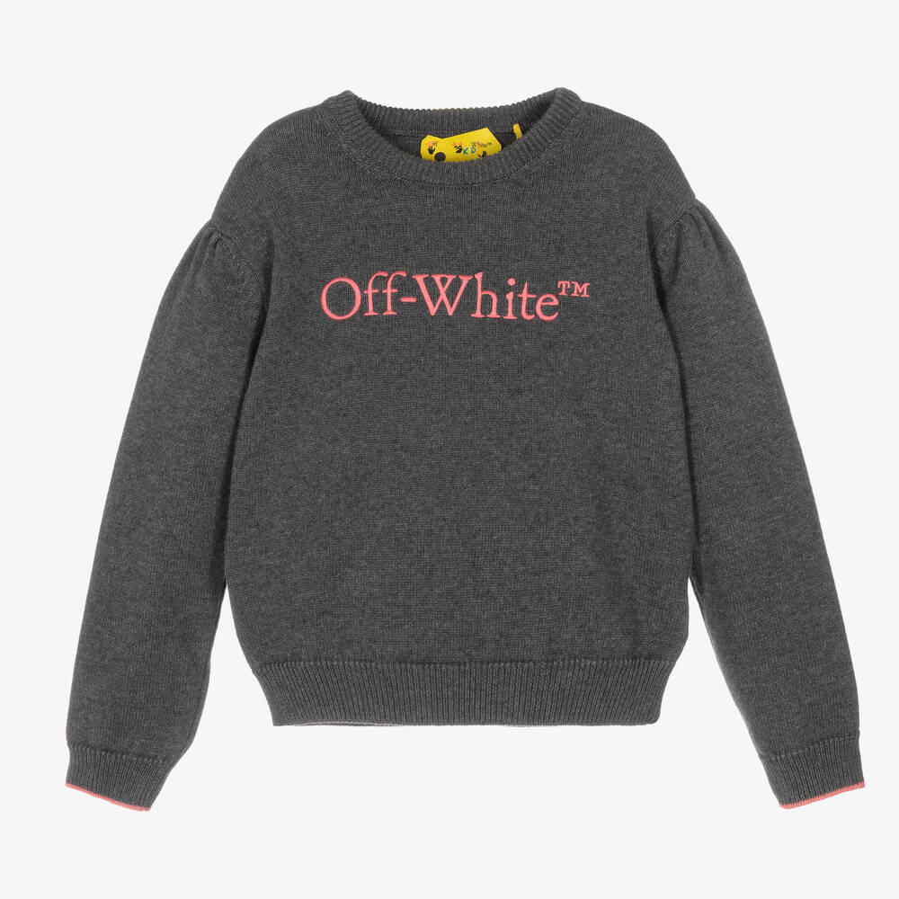 Charcoal grey sweater for girls by contemporary luxury brand, Off-White. Knitted in a soft cotton and wool blend, this cosy layer has a relaxed fit and puffed sleeves with pink piping. It is embroidered with the iconic Bookish logo on the front for instant designer appeal.