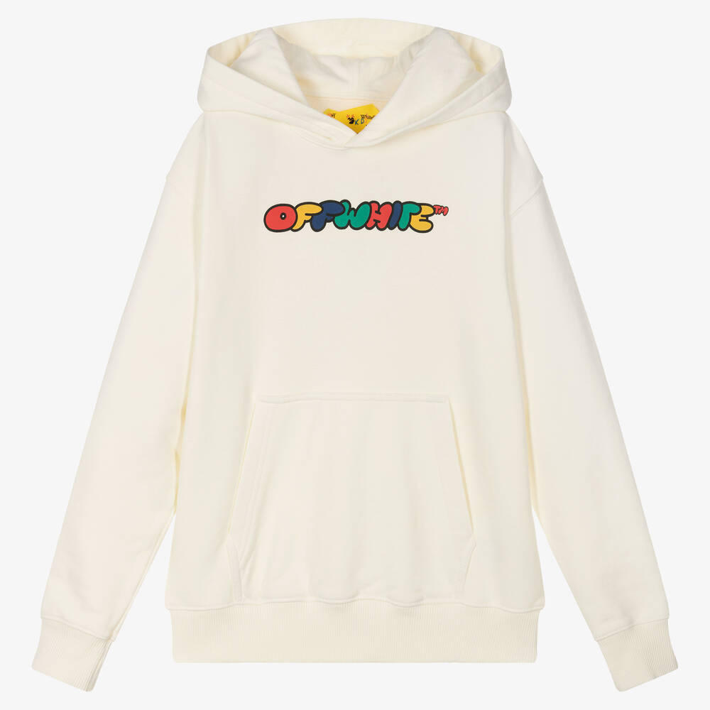 From streetwear brand Off-white, an ivory cotton hoodie for teen boys. For instant brand recognition, it features a multicolour logo on the front and bold multicolour arrows at the back. Casual and comfortable, it is made in mid-weight jersey with a cosy fleecy inside. There are ribbed trims and a pouch pocket on the front.
