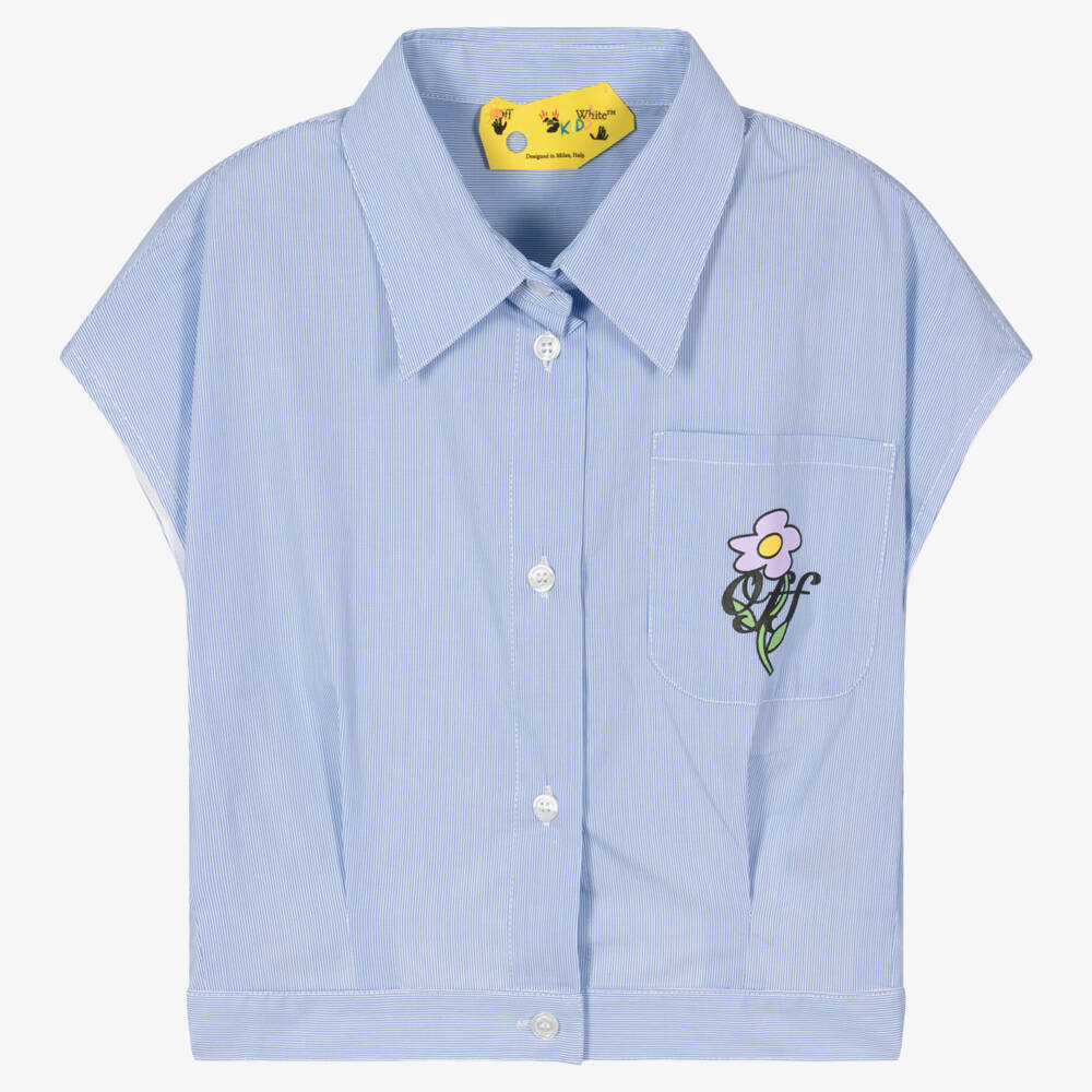 Mixing chic with streetwear, this blue and white stripe shirt for teen girls is from luxury brand, Off-White. The brand's retro-style script logo is printed on the pocket and the back, with a lilac purple floral graphic for a feminine designer touch. This classic cotton poplin shirt comes in a stylish cropped fit, with a cool pointed collar and pleated darts.