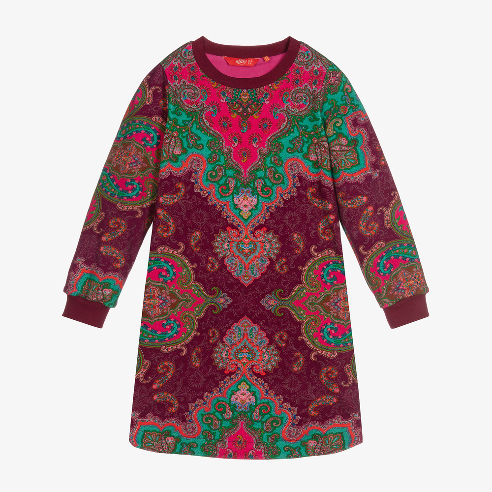 Beautiful pink, green and purple dress for girls by Oilily, with an elaborate Paisley pattern. Made in soft, stretchy cotton jersey with ribbed trims, it is both comfortable and stylish. There are useful concealed pockets on the side seams and a logo tab by the hemline.