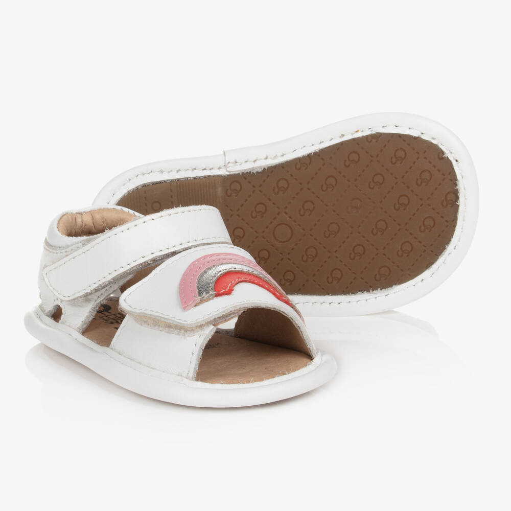 White first-walker sandals for baby girls by Old Soles. Made and lined in soft leather, they have a cute rainbow design in pink and silver on the front. There is a cushioned insole for comfort and support, with velcro straps for easy fastening, and non-slip rubber soles for good grip.