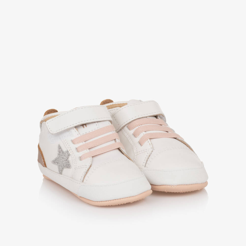 White and rose gold trainers for baby girls by Old Soles, with a glittery silver star design. These podiatrist-approved shoes are made in soft and breathable leather with a removable antibacterial footbed. The elasticated laces, velcro strap and stretchy heels allow for easy slip-on and comfortable fit. The flexible rubber sole improves grip, making it ideal for little ones when taking their first steps.