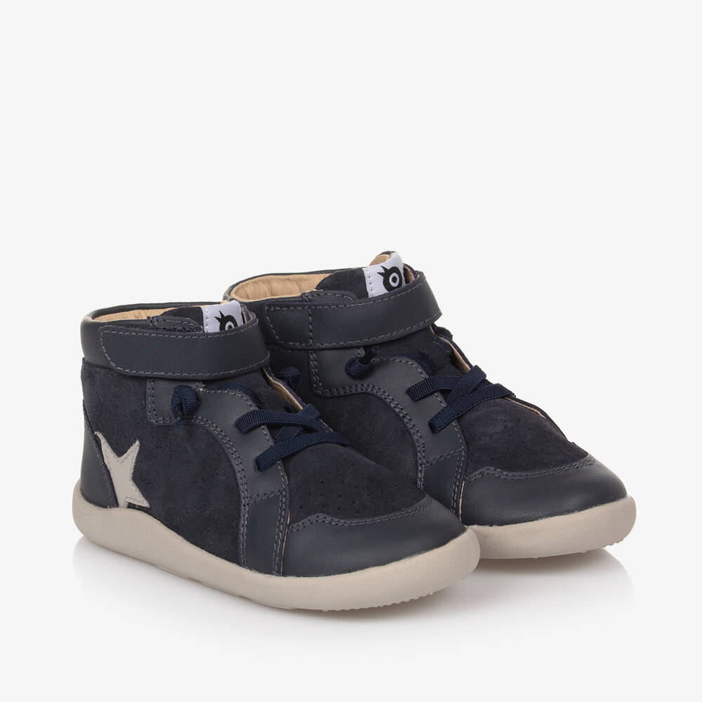 Navy blue high-top trainers for boys and girls by Australian footwear label Old Soles, in suede leather with smooth leather trim and a grey star appliqué. Soft, supple and comfortable to wear, they have a breathable microfibre lining and a removable cushioned insole that is absorbent and antibacterial to promote foot health. Podiatrist-approved, these lightweight shoes boast padded ankles, adjustable velcro and elastic laces for a secure fit. The outer sole is flexible and non-slip, helping to support posture and balance.