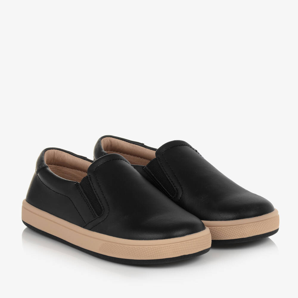 Smart casual black slip-on trainers for boys by Old Soles, made from soft leather. Lined in breathable microfibre, these shoes have small elasticated panels on the sides to ensure a comfortable fit. The beige and black non-slip rubber outsole offers better grip.
