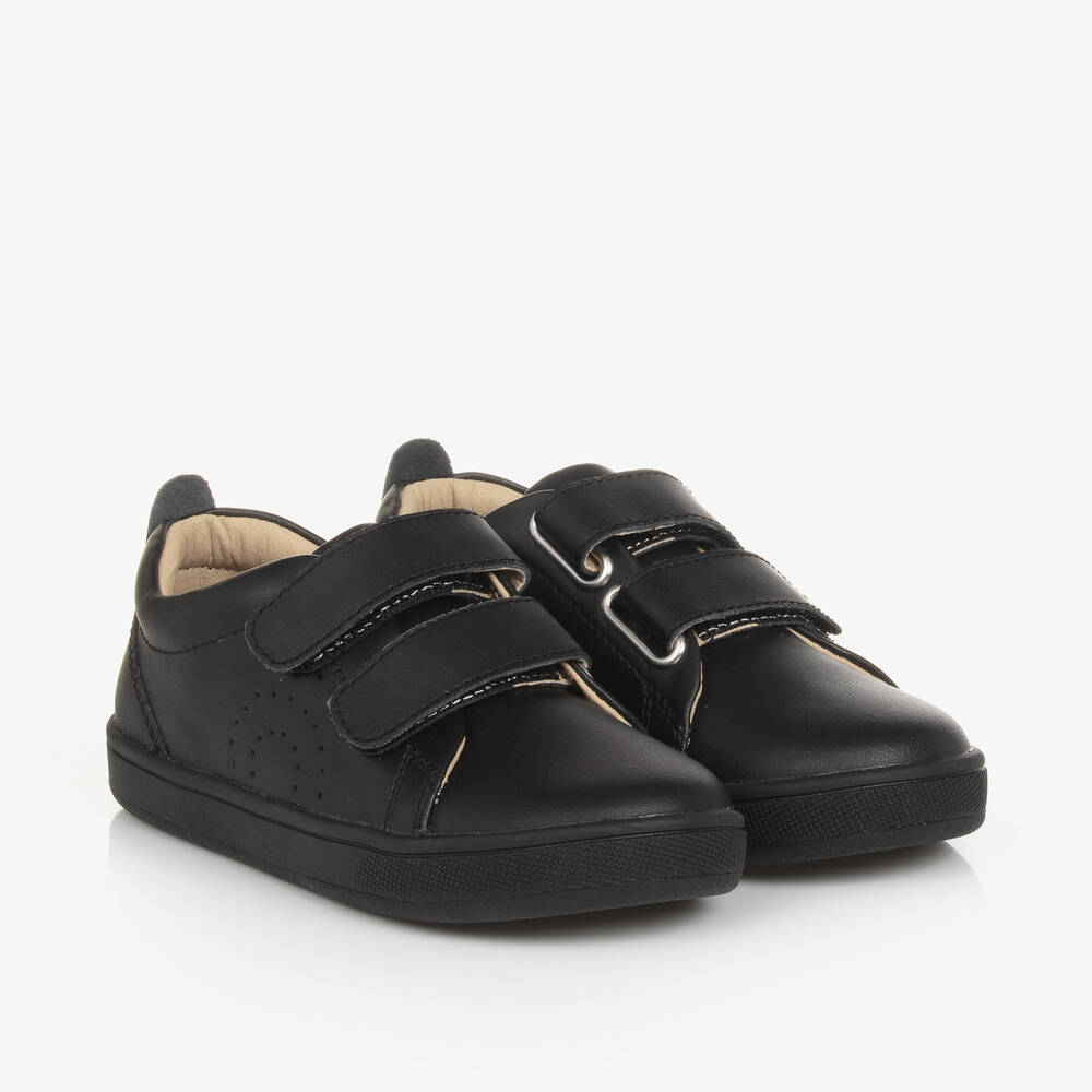 Black leather trainers for boys by Old Soles, with smooth leather uppers and a breathable microfibre lining for ultimate comfort. These trainers feature removable cushioned insoles and padding around the ankles for extra support. They fasten with velcro straps across the foot for an easy and secure fit and have non-slip rubber soles for a sturdy grip.