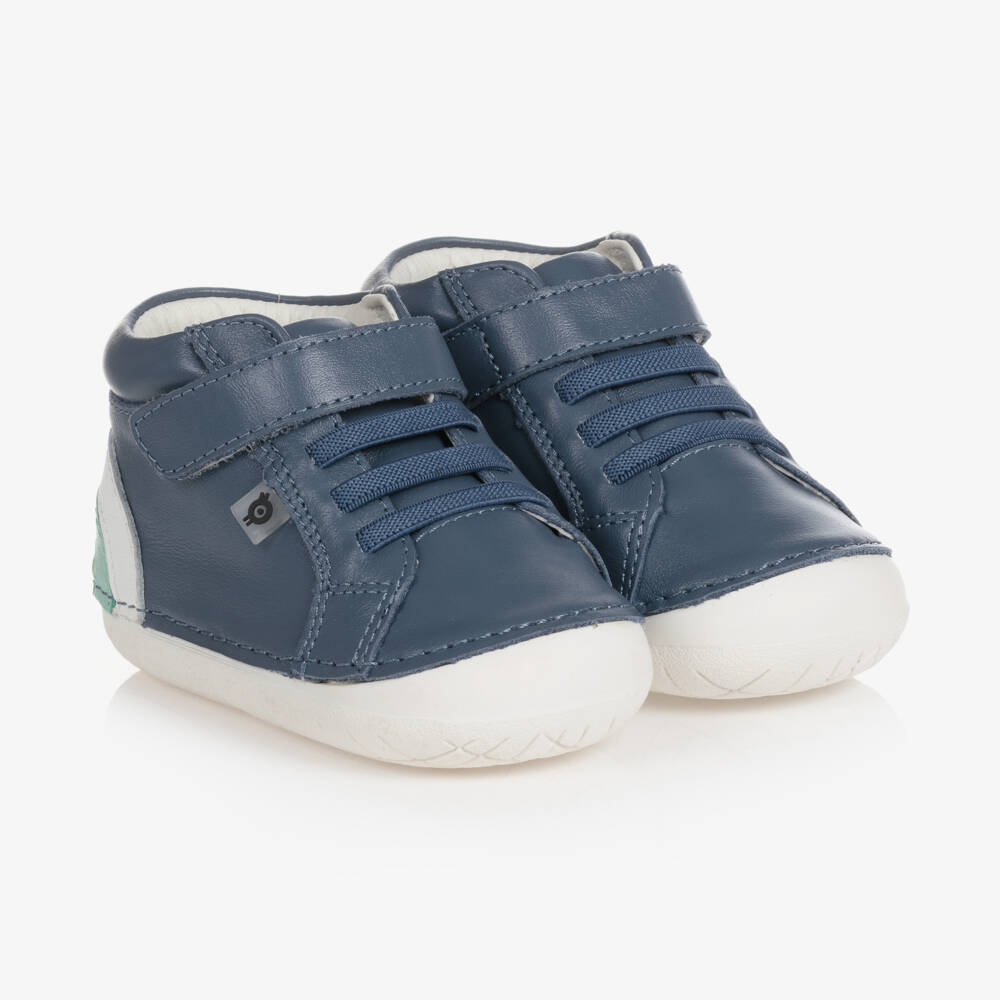 Navy blue high-top trainers for little boys by Old Soles, with a white, green and grey rainbow design on the back. Made and lined in soft leather, the ankle and insole are cushioned for comfort and support. Fastening easily with a velcro strap, they have elasticated laces for easy pull on, with a non-slip rubber sole for good grip.