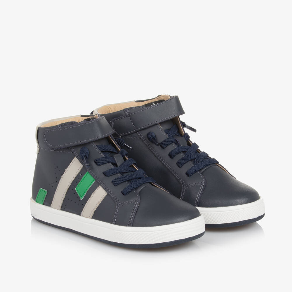 Navy blue high-top trainers for boys by Australian footwear label Old Soles, made in soft and supple leather with green and grey stripe trim. Designed to allow natural movement for active children, they have a breathable microfibre lining and a removable, cushioned insole that is absorbent and antibacterial to promote foot health. Podiatrist-approved, these lightweight, sporty shoes boast padded ankles, adjustable velcro and elastic laces for a secure fit. The outer sole is flexible and non-slip, helping to support posture and balance.