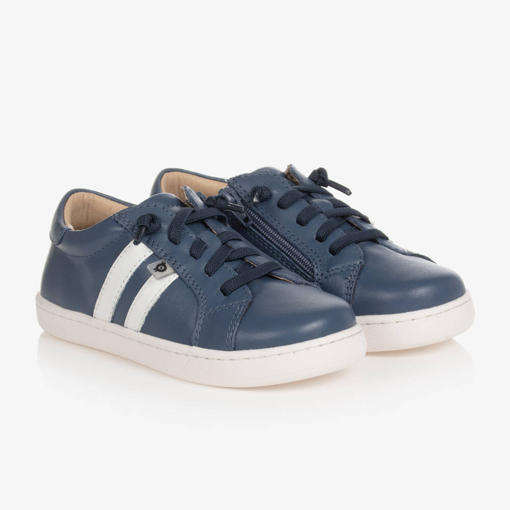 Blue trainers for boys by Old Soles, with double white stripes on the side. Made and lined in soft leather, the ankle and insole are cushioned for comfort and support. Fastening easily with a zip on the side, they have elasticated laces for easy pull on, and a non-slip rubber sole for good grip.