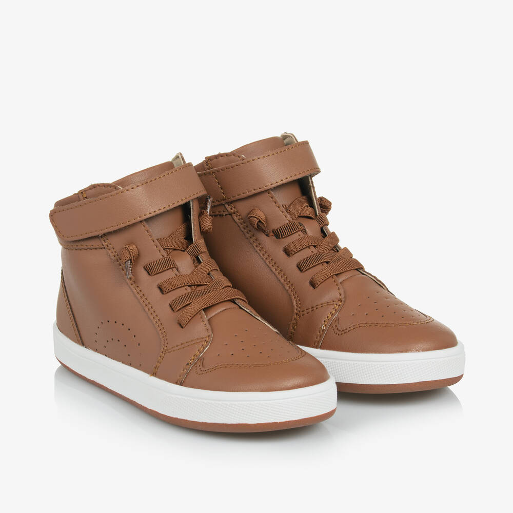 Tan brown high-top trainers for boys by Australian footwear label Old Soles, made in soft and supple leather. Designed to allow natural movement for active children, they have a breathable microfibre lining and a cushioned insole that is absorbent and antibacterial to promote foot health. Podiatrist approved, this smart yet sporty style boasts padded ankles, with adjustable velcro and elastic laces for a secure fit. The outer sole is flexible and non-slip, helping to support posture and balance.