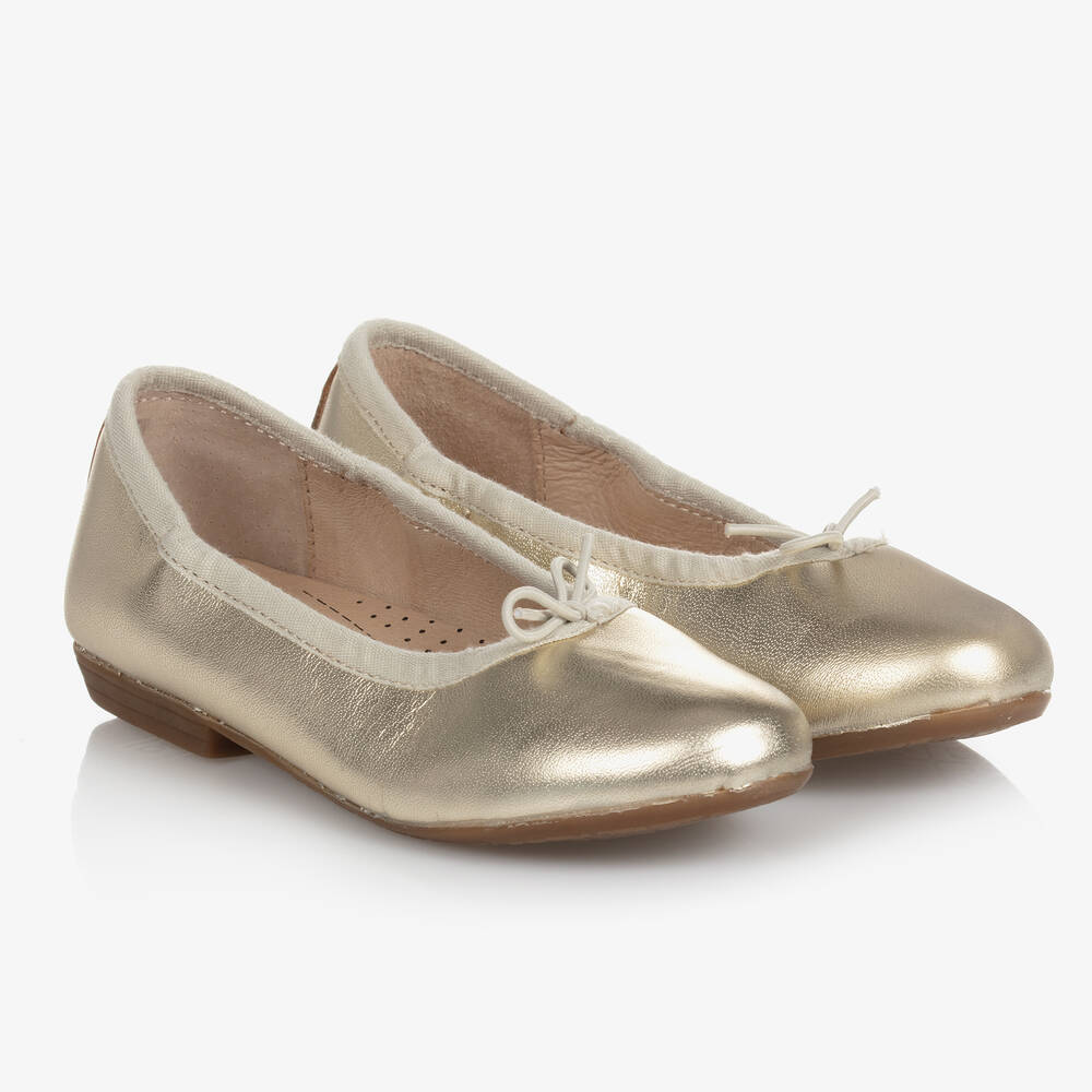 Girls metallic pale gold ballerina shoes from Old Soles, made in soft and supple leather. They are trimmed with beige fabric around the openings for comfort and have a sweet little bow. Lined with breathable leather, they have a lightly padded leather insole to absorb moisture, with arch support to correct posture. Chic for both casual or smarter occasions, they are easy to slip on and have a flexible rubber outsole.
