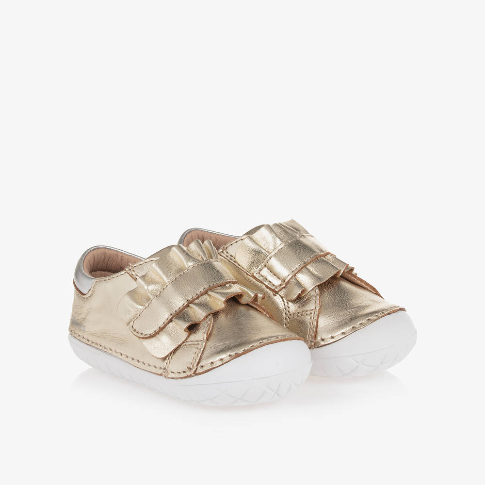 Adorable gold leather first-walker shoes for little girls by Australian brand Old Soles, with an adjustable velcro strap and pretty ruffle trim. Soft and supple, they are designed to promote natural movement and healthy foot growth, with plenty of room for wiggly toes. The outer shoe and lining are made from premium leather with a cushioned heel and insole for comfort. The flexible, non-slip outer sole allows for the natural development of sensation, balance and strength as little ones transition from crawling to cruising and walking.