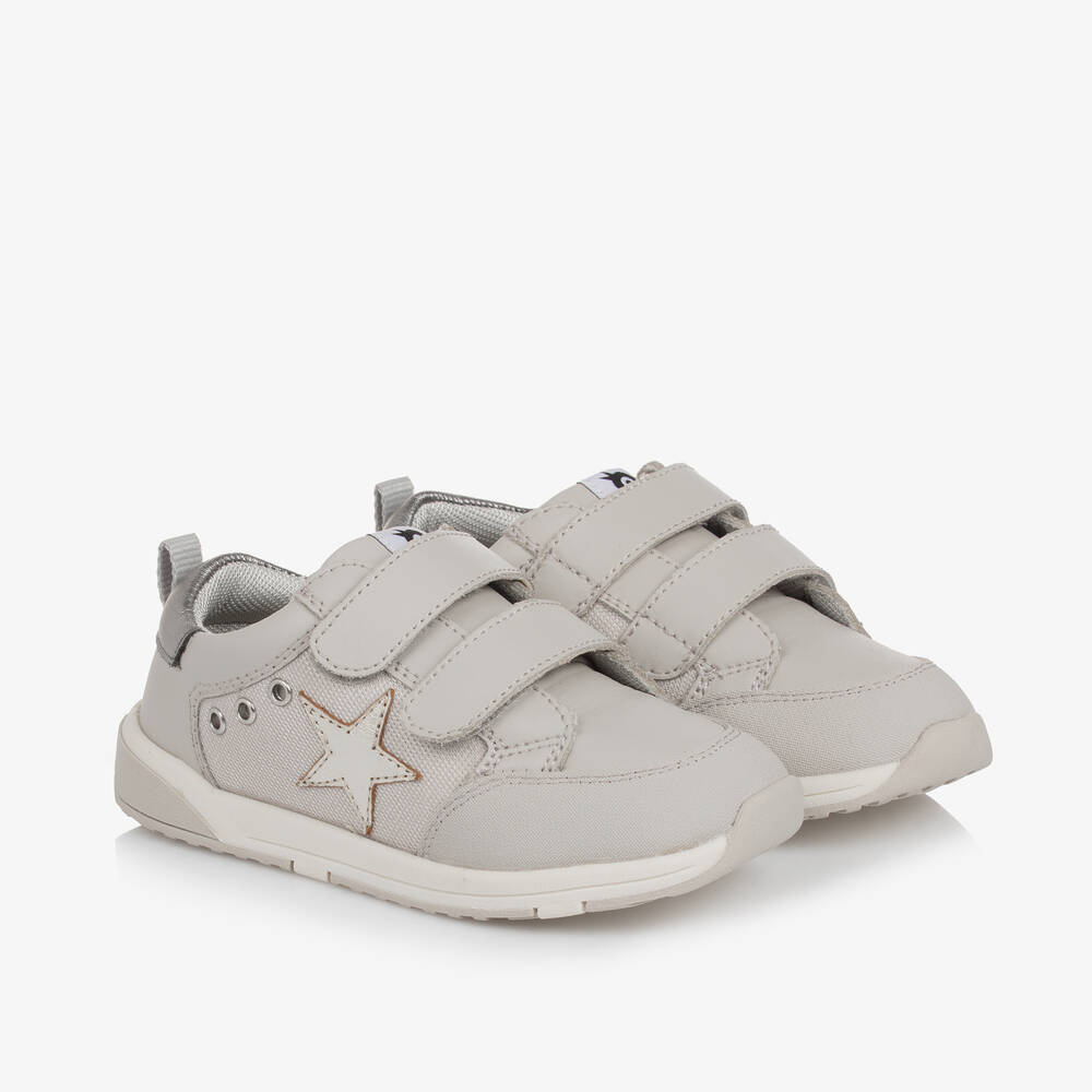 Sporty grey trainers for younger girls by Old Soles, made with supple leather and breathable mesh uppers. A metallic star appliqué adds a stylish touch and they have two velcro-fastening straps for an adjustable fit. They are comfortably lined in soft, breathable mesh and have removable cushioned insoles that are breathable, absorbent and antibacterial. The flexible, non-slip rubber soles are ridged for good grip.