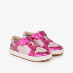 Girls pink trainers by Old Soles, combining style with comfort. Made in leather, they have a vibrant metallic pink and silver finish, with contrasting pale pink panels and a fun leopard print heel. They have elasticated laces and a velcro strap for a secure fit, with a cushioned insole and a non-slip rubber sole for comfortable wear.