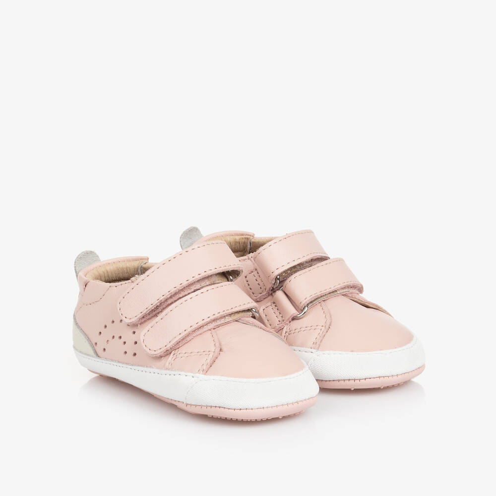 Cute pink first walker trainers for little girls by Old Soles, made and lined in soft and supple leather. Fastening easily with two adjustable velcro straps, these comfortable shoes are designed to promote natural movement and healthy foot growth, with plenty of room for wiggly toes. They have a removable, antibacterial, cushioned insole and a thin but grippy outer sole that allow for natural development as little ones transition from crawling to cruising and walking.