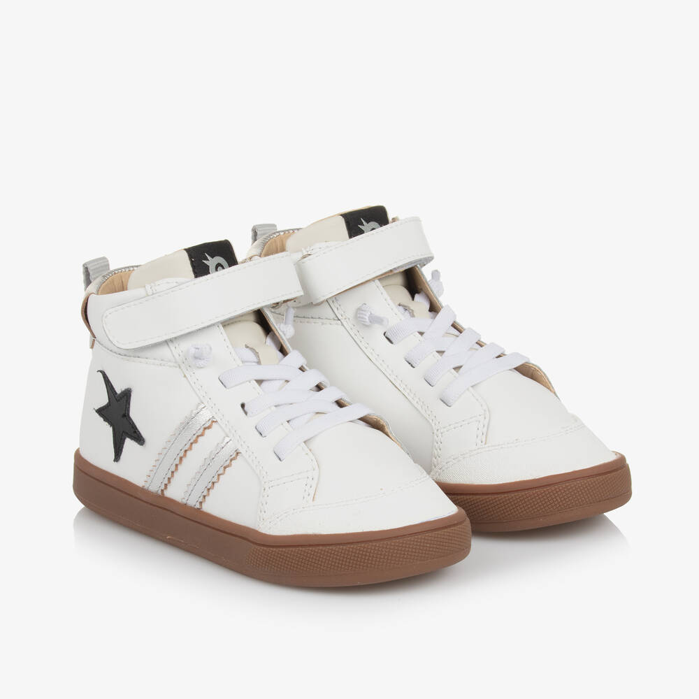 White leather high-top trainers for girls by Australian footwear label Old Soles, with a black star and silver stripe trim for a sporty look. Designed to allow natural movement for active children, they have a breathable microfibre lining and a removable, cushioned insole that is absorbent and antibacterial to promote foot health. Podiatrist approved, these lightweight shoes boast padded ankles, an adjustable velcro strap, and elastic laces for a secure fit. The outer sole is flexible and non-slip, helping to support posture and balance.