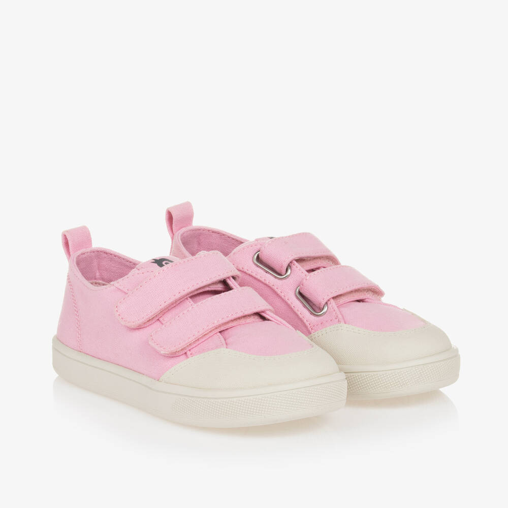 Pink canvas trainers for girls from Australian designer Old Soles. Comfortable to wear, this casual style has lightly cushioned insoles and two velcro fastening straps across the foot. There is a logo print on the tongue for a discreet designer detail and a useful pull tab on the back. They are finished with flexible, white rubber outer soles providing good grip underfoot.