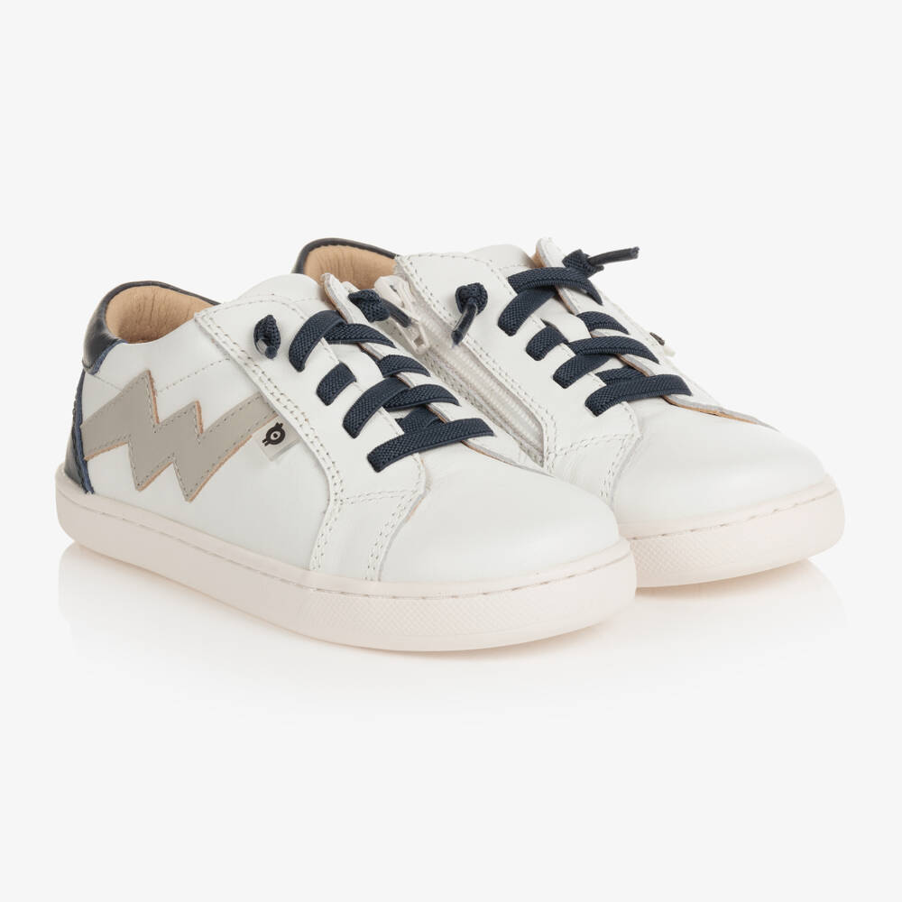 Cool white leather trainers for boys and girls by Old Soles. Made for comfort, they have a padded insole and soft leather lining whilst the rubber outer sole helps improve grip under foot. The heels are trimed with navy blue panels and grey lightening bolts on the side give a fashionable finish. For easy dressing they have elasticated laces and side zip fastenings.