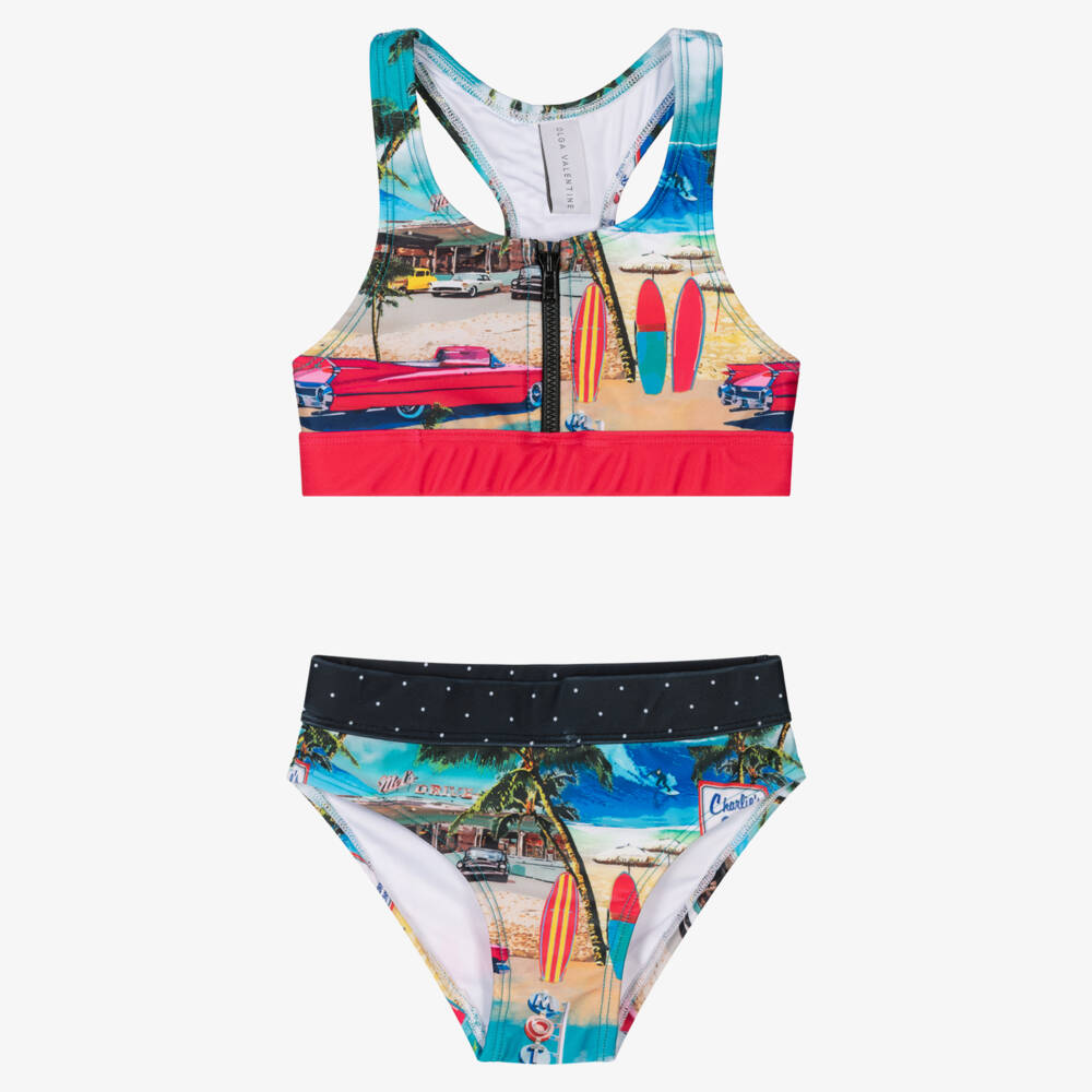 Both sporty and stylish, a bikini for girls by Australian swimwear brand Olga Valentine with a vintage red Cadillac and beach scene pattern. Just right for girls on the move, the top has a racer back, zip up front and a durable elasticated red hemline. The bottoms have an equally sturdy, navy blue waistband with polka dots. Silky, stretchy and fully lined for comfort, it is made in recycled Repreve materials with a UPF50+.