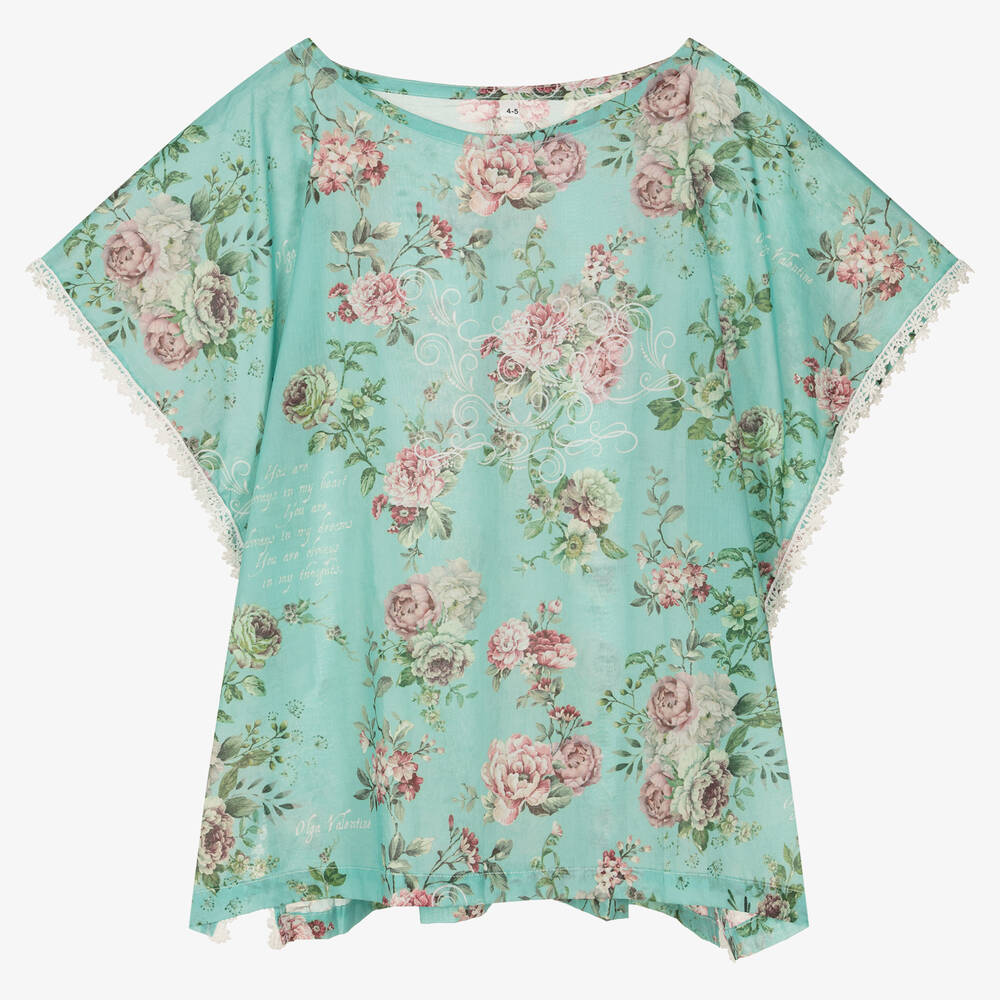 Lovely green cotton kaftan for girls by Australian swimwear brand Olga Valentine, with a vintage pink rose, love letter and logo pattern. Made in lightweight, breathable voile, it has a pretty white lace trim along the sides. It pairs beautifully with the designer's swimwear and can be thrown over the top when heading to and from the beach or pool.