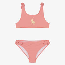 Pretty green bikini for girls by Olga Valentine, with a beautiful pink floral print. Silky soft and stretchy, it has a UPF50+ rating and is fully lined for comfort. The top part is ruched, with frilly trims and adjustable shoulder straps.