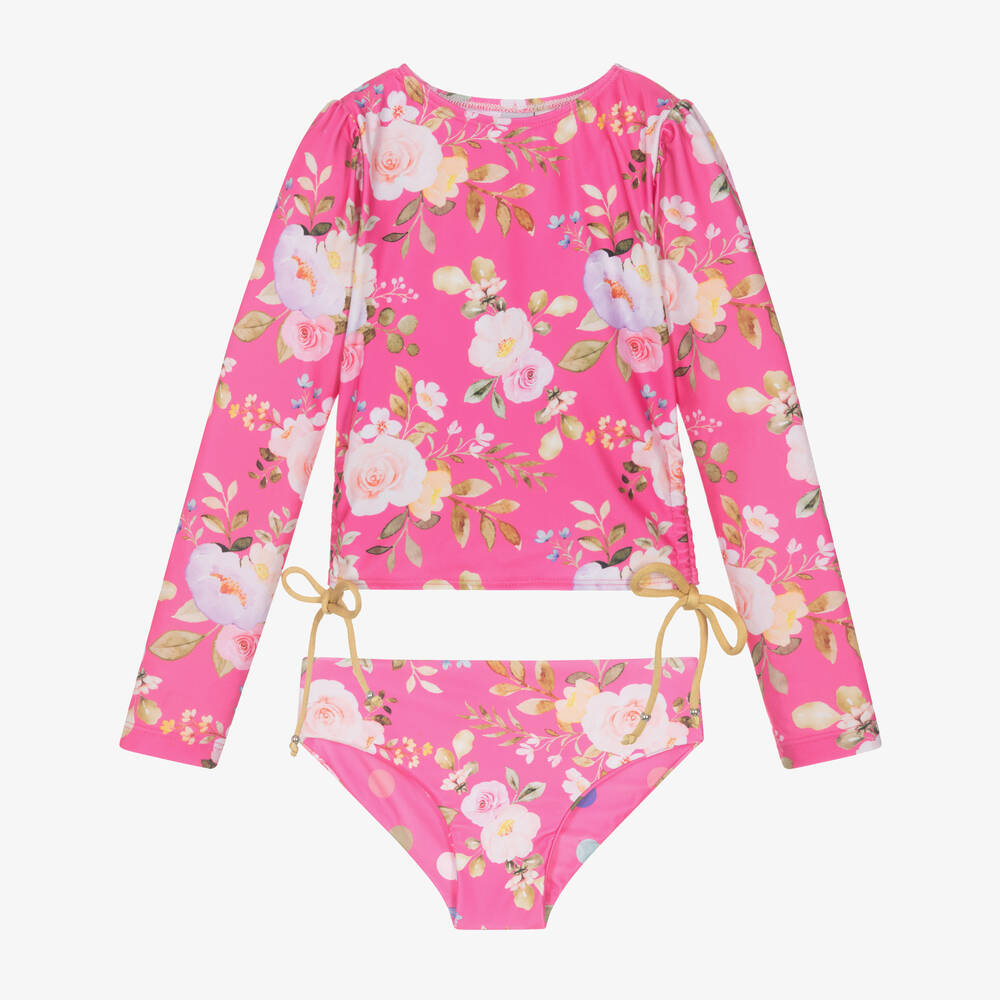 Bright pink tankini for girls by Australian swimwear brand Olga Valentine, patterned in a beautiful floral print. It is made in silky soft and stretchy recycled fabric, with UPF 50+. The long-sleeved top has pretty gathers around the shoulders and shimmery gold drawstrings to ruche the sides. The matching bottoms are reversible, patterned in colourful polka dots on the other side.