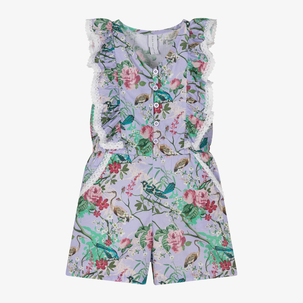 Pretty and feminine for girls, this casual lilac purple playsuit is by Australian brand Olga Valentine. It is patterned in a beautiful flower and bird print, with ruffles and delicate lace trims. Great for casualwear on warm sunny days, it is made in soft and lightweight cotton. There is a gently elasticated waist, front button fastenings, and useful front pockets.