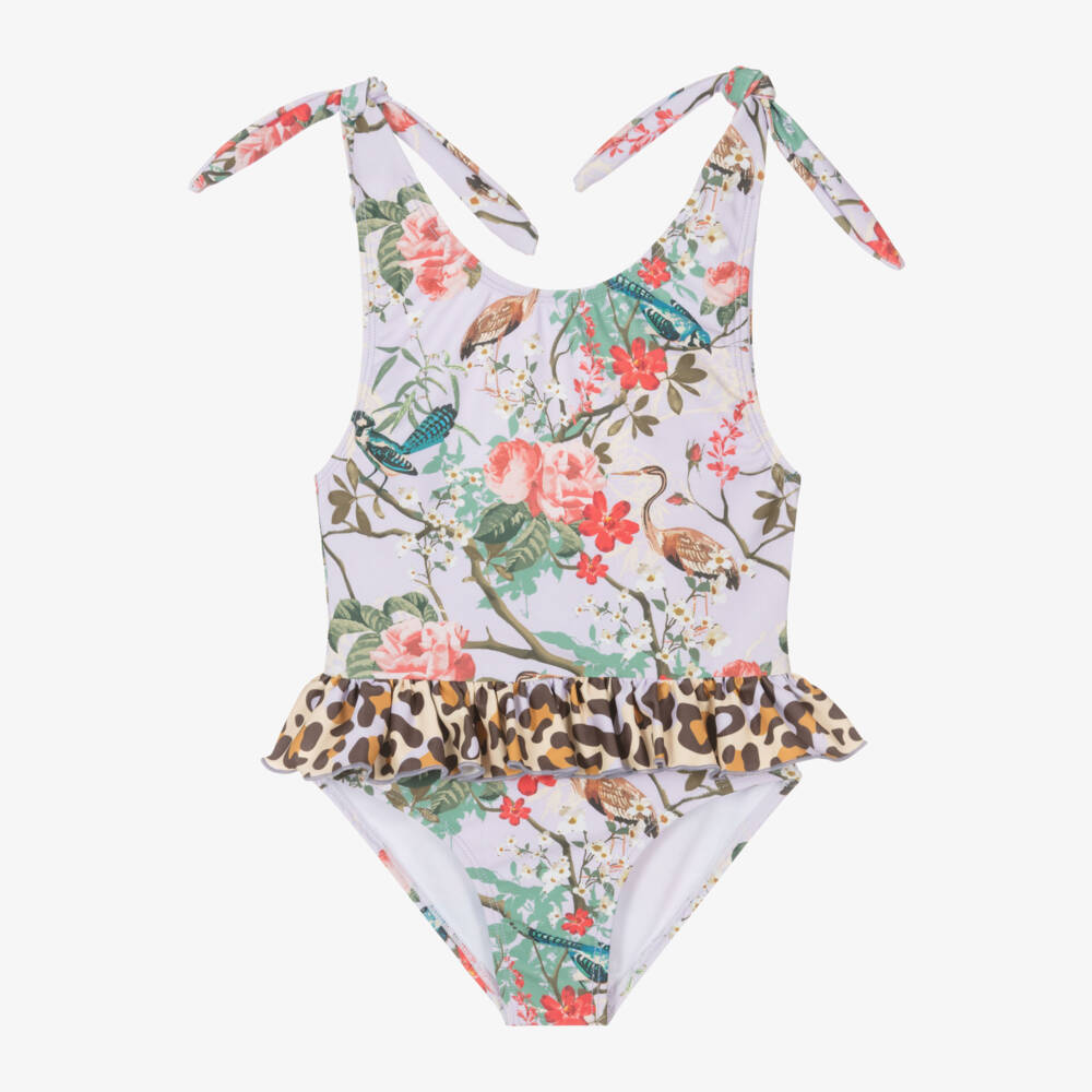 A charming lilac purple swimsuit for girls by resortwear brand Olga Valentine, in a silky smooth recycled fabric with UPF50+. It is patterned in a vibrant wild garden design with contrasting leopard print ruffles for an eye-catching poolside look. Fully lined, it has a scooped neck and an open back with ties that fasten into pretty bows.