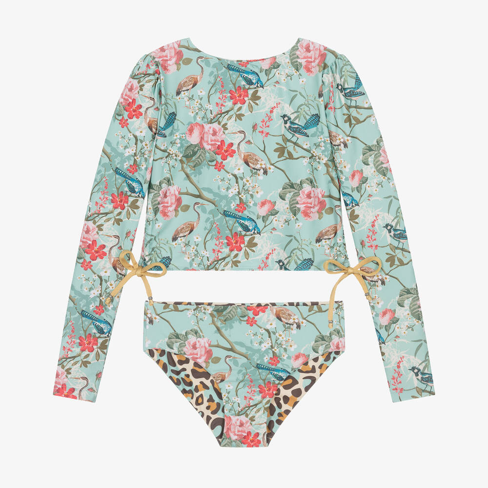 From Australian label Olga Valentine, this stylish green tankini is for teen girls. A contemporary design, the long-sleeved top is fully lined and printed with beautiful flowers and birds. It has slightly puffed shoulders for a feminine look and gold tie fastenings that create ruching on both sides. To change up the look, the bottoms are reversible with a contrasting beige and brown leopard print. This two-piece is made from silky, stretchy recycled fabric with UPF50+.