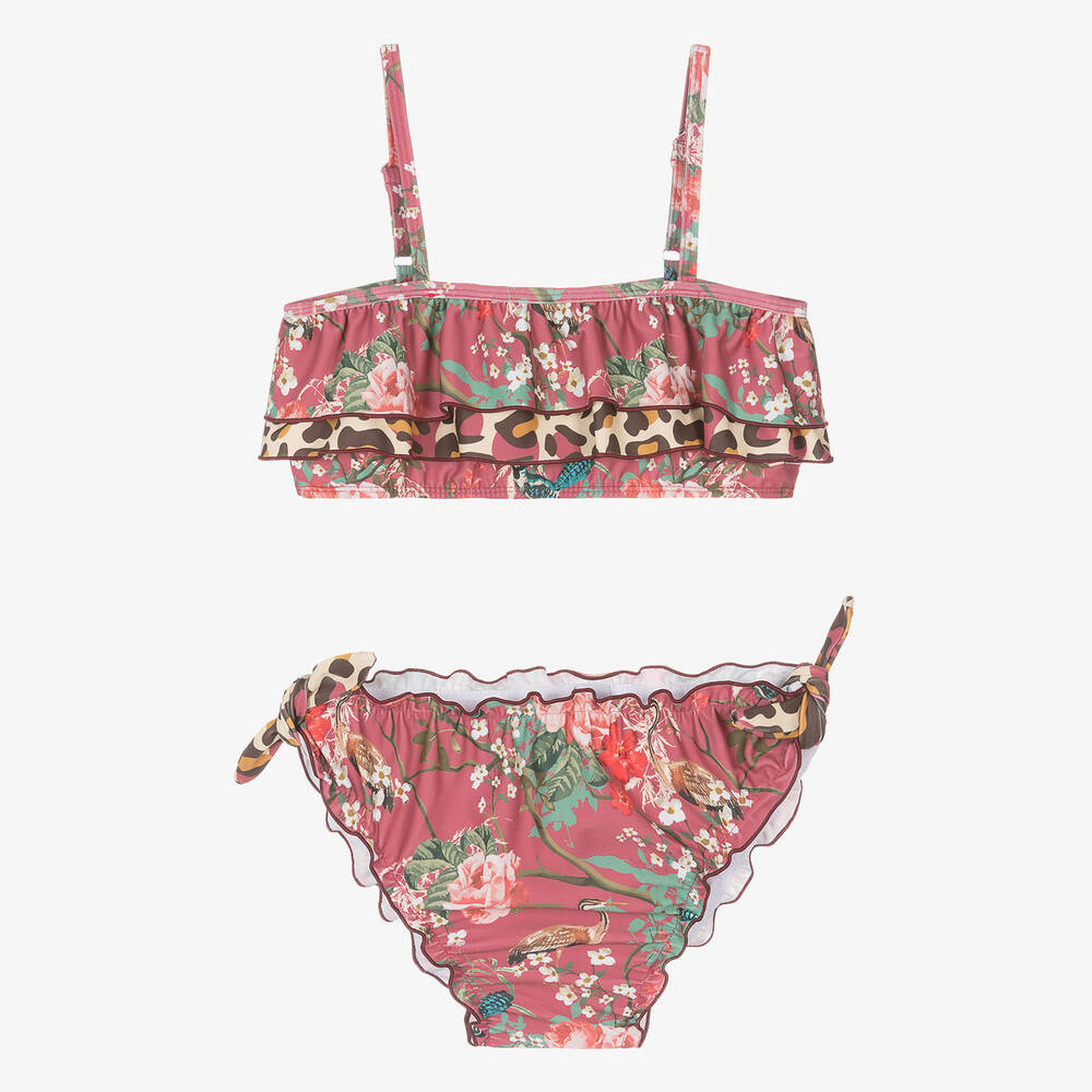 Teen girls stunning dark pink floral bikini, designed by Olga Valentine with bold leopard print trims. A stand-out style for the resort, the bandeau top is decorated in layered ruffles and the frilly bikini bottoms have side bows. Adjustable shoulder straps detail the top for a beautiful fit. This swimwear piece is made from a silky smooth UPF50+ fabric with a full lining.