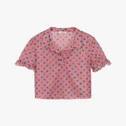 Mid pink lumiére shirt for girls by resort wear brand Oséree, made in lightweight, glittering material. Designed to sit higher on the waist, this semi-sheer top is styled with short sleeves and an open-collared neckline.
