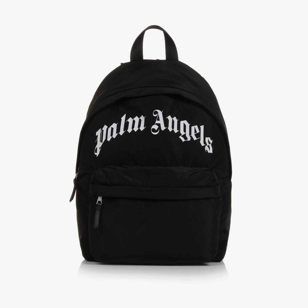 Black backpack for boys and girls by Italian fashion house Palm Angels, great for carrying everyday essentials. For instant brand recognition, the signature Palm Angels logo is printed in white on the front. Made in silky smooth fabric, the bag has a zip fastening main compartment and a smaller zipped pocket on the front. There are gently padded, adjustable shoulder straps, as well as a carry handle. A useful name and address label can be found inside the bag, printed with the designer's iconic Bear graphic