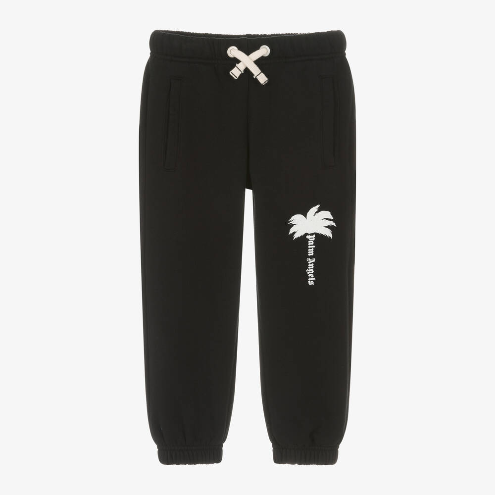 Black cotton joggers for boys by Italian brand Palm Angels, with a vertical palm logo in white on one leg for a signature look. Made in soft, mid-weight jersey with a cosy, fleecy inside, they have a drawstring waistband for a great fit and useful front pockets.