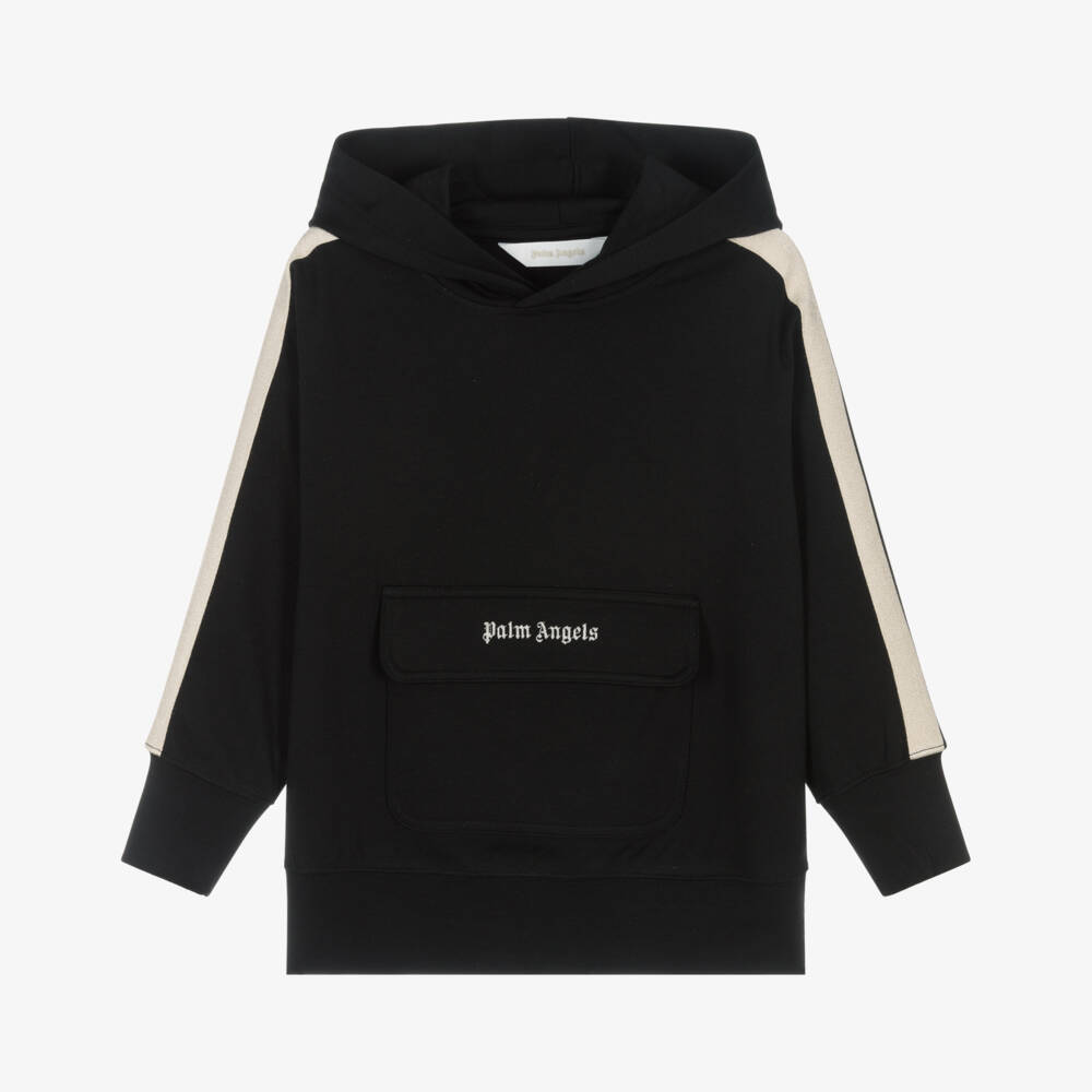 Black hoodie for boys by Italian brand Palm Angels, made in soft and stretchy, viscose-blend jersey. There are iconic gold striped trims on the sleeves for a cool, sporty look and a patch pocket on the front with an embroidered logo for a statement finish.