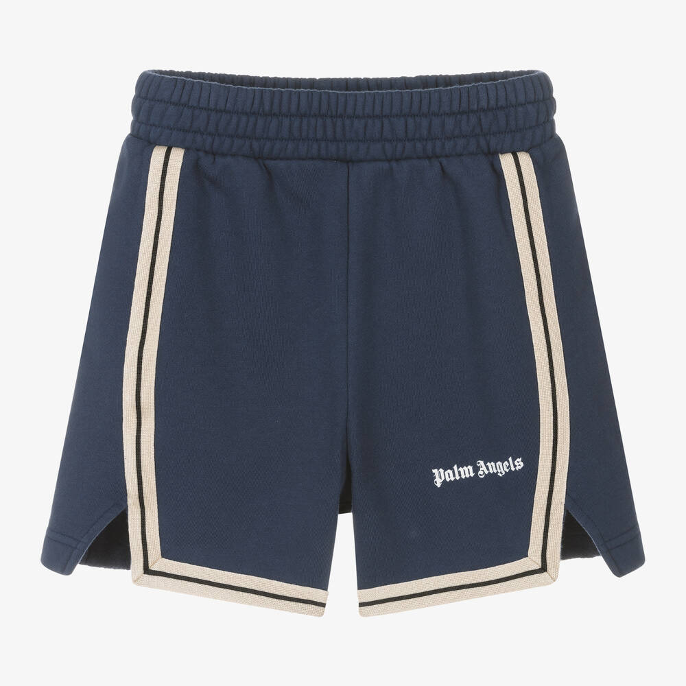 Super cool blue shorts for boys by Italian brand Palm Angels, with a white logo on one leg for instant designer appeal. They are made in mid-weight, cotton jersey that has a cosy, fleecy inside. Beige and black striped taping and cut-out 'V' detailing on the front add a stylish touch. They have an elasticated waistband and are easy to wear, simply pulling up.
