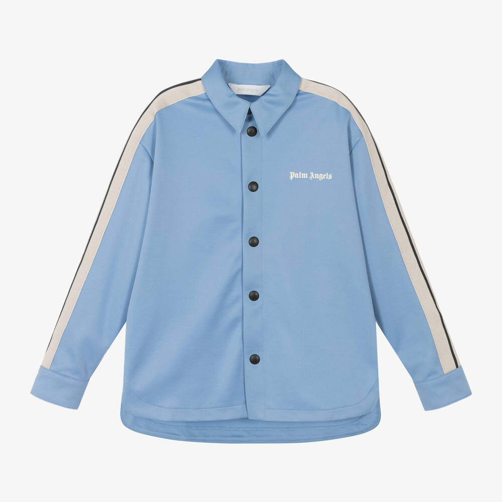 A cool and casual blue shirt for boys from Palm Angels, made in comfortable cotton-blend jersey. The long sleeves are trimmed with dark ivory and black striped tape adding to the sporty vibe, with the brand's logo on the chest giving a signature finish. It has a shaped hem, which is longer on the back and contrast black popper fastenings down the front and on the cuffs.