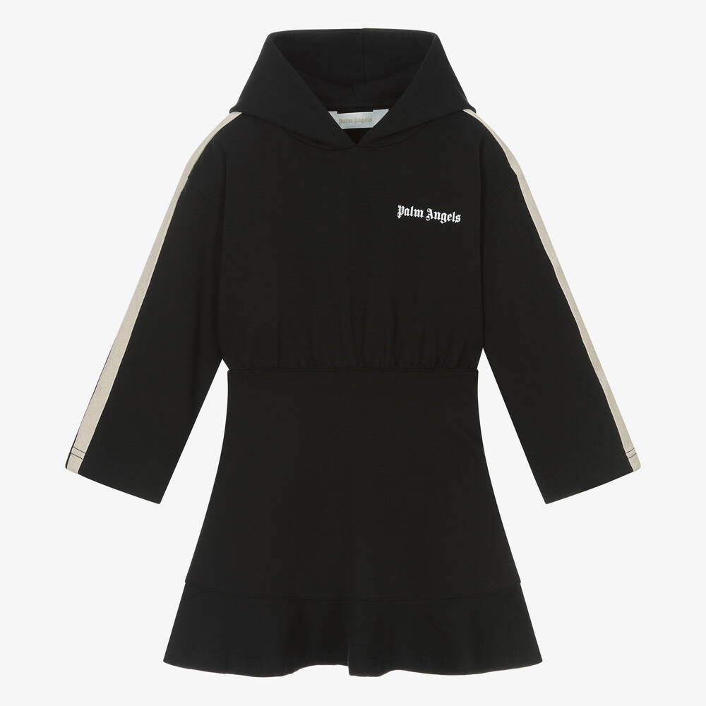 Stylish black hooded sweatshirt dress for girls by Palm Angels, made from soft Milano jersey. Adding a sporty touch to a comfortable style, it has wide beige and black taping along the sleeves and a gently elasticated waist above the pretty, flared skirt. For instant designer recognition, the brand's logo is printed in white on the chest.