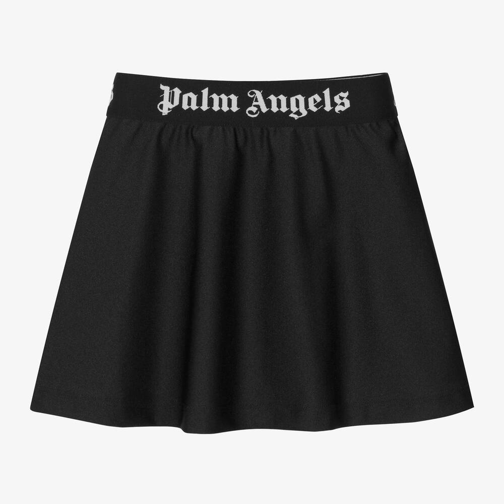Sporty black mini skirt for girls by Palm Angels, made from silky and stretchy jersey. Great for an active look, it has an elasticated jacquard waistband featuring bold white Palm Angel logos for a signature finish. Easy to pull on, this casual skirt is comfortable to wear.