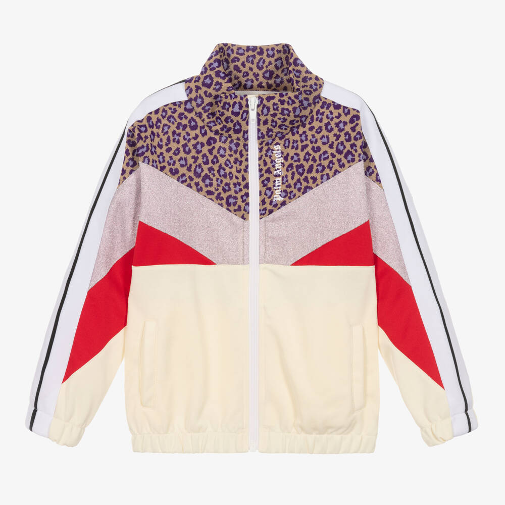 A stylish ivory zip-up track top for girls by Italian brand Palm Angels, made in soft and stretchy fabric. This eye-catching piece has contrasting panels on the upper body, featuring a purple and beige leopard print, a glittery pink trim and a bold red chevron stripe. The sleeves are trimmed with black and white stripes for a retro sports feel. With a full zip front, the design includes useful front pockets, elasticated cuffs and a matching hem. A white Palm Angels logo print can be seen on the chest for instant brand identity.