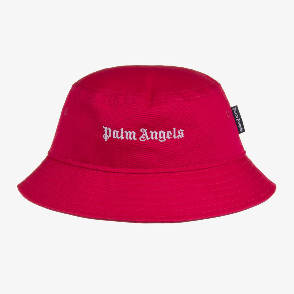 Fuchsia pink bucket hat for girls by Italian brand Palm Angels, made in durable cotton twill. For a signature look, it has the designer's white iconic logo embroidered across the front.