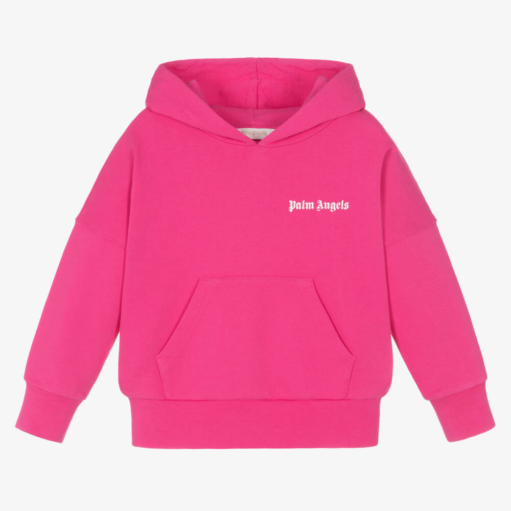 Fuchsia pink organic cotton hoodie for girls by Italian brand Palm Angels. It has the designer's iconic logo printed in bold letters on the back, with a smaller logo printed on the front. Casual and comfortable, it is made in soft mid-weight jersey, with ribbed trims and a sporty pouch pocket.