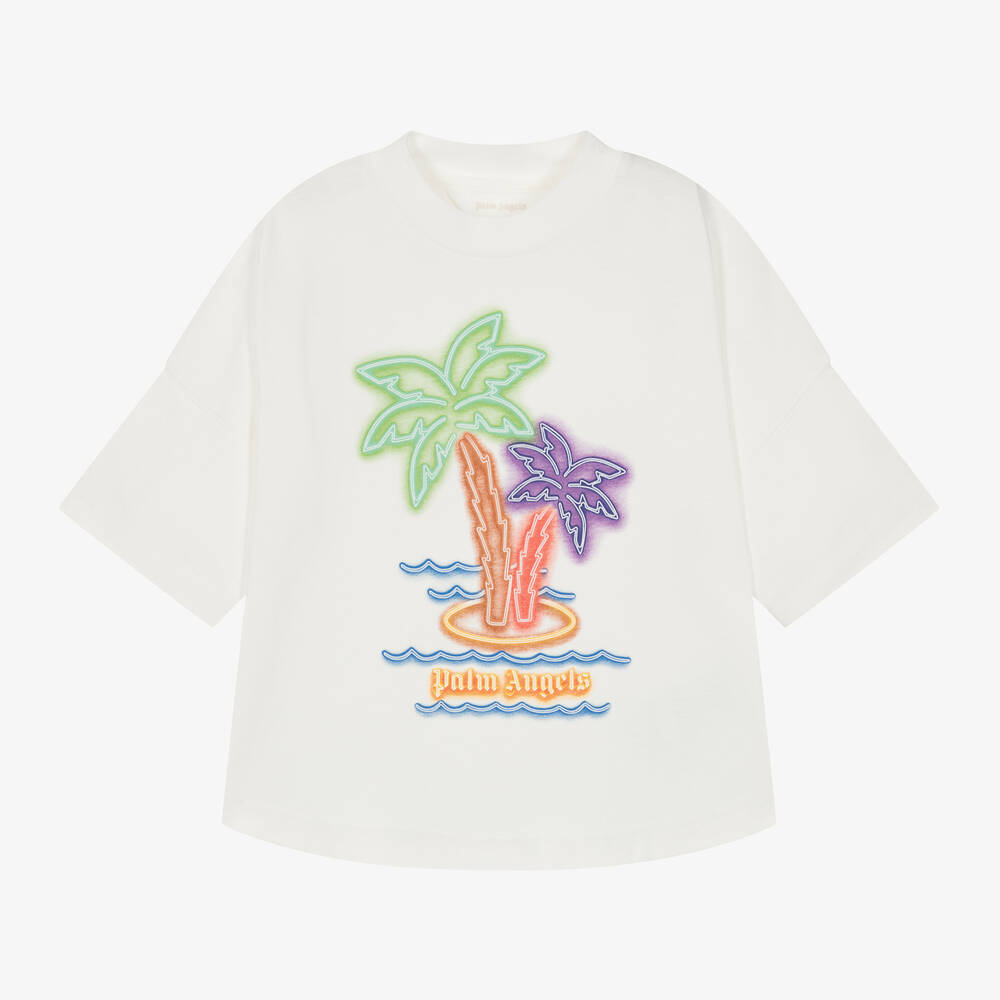 Italian streetwear label Palm Angels designs this ivory T-shirt for boys and girls. This short-sleeved style is made from soft-on-the-skin organic cotton jersey, in an oversized fit with dropped shoulders for relaxed comfort. Unmistakably designer, a vibrantly coloured neon light-effect palm tree and logo graphic is printed on the front.