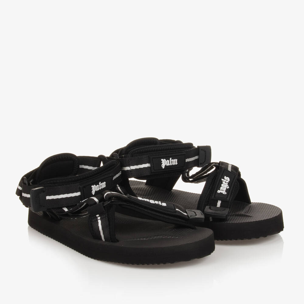 Cool, urban styling for teen boys, these black sandals are from Italian fashion brand, Palm Angels. Bold rubberised logos and contrast white trim add instant designer appeal. Made in collaboration with Suicoke, they have a lightweight and flexible footbed for comfort and a branded patch on the foot strap. For an adjustable fit, they are finished with velcro straps across the toes and around the ankle.