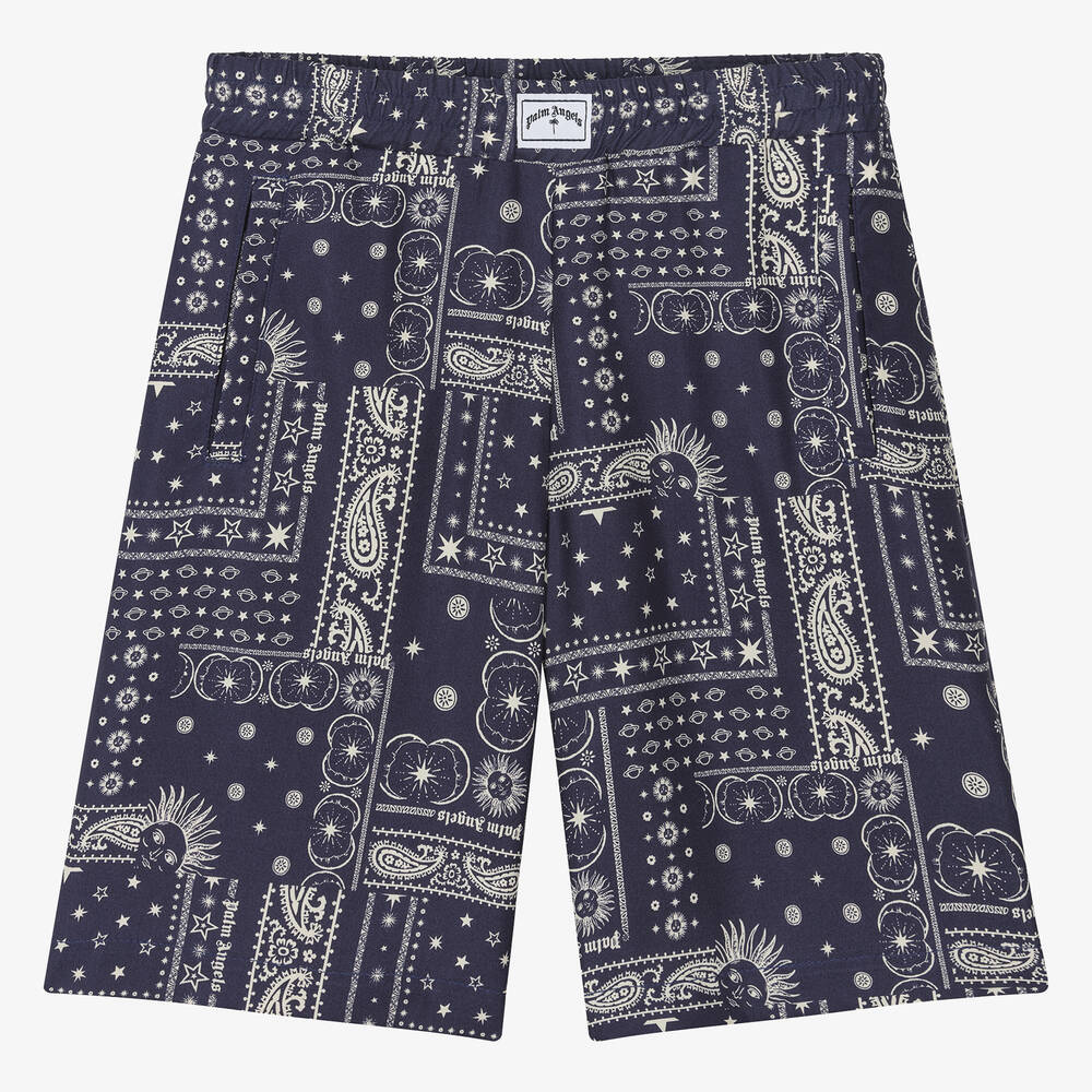 Dark blue and ivory viscose shorts for teen boys from Palm Angels. The Italian brand, inspired by Los Angeles skater culture, has styled these cool shorts with a mix of patchwork-style bandana prints, which include mystical moons, paisley and stand-out branding. These silky, woven shorts have handy side pockets, a logo label, and an elasticated waist for lasting comfort. These shorts are made with 75% sustainable viscose.