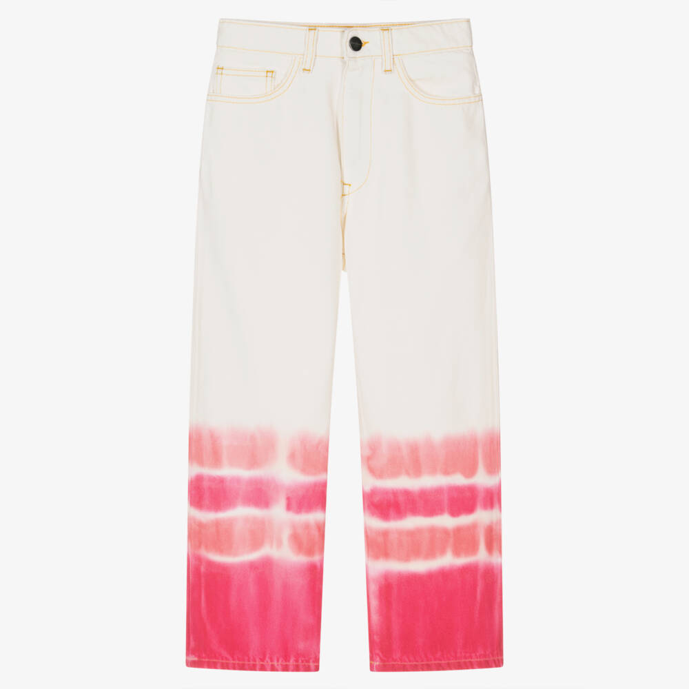 Offering a cool streetwear look, these white and pink tie-dye jeans for teen girls are from luxury Italian label, Palm Angels. In a relaxed straight fit, they are made in a soft cotton denim, with a classic five-pocket styling. Fastening with a zip and a branded button, they have a logo-embossed jacron patch on the back, for a subtle designer touch.