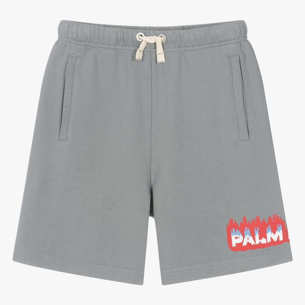 A distinctive style from streetwear fashion label Palm Angels, deep grey organic cotton shorts with pockets for teen boys and girls. Edgy red and blue flame branding is stamped on one side for that stand-out look. Made from soft and comfortable jersey, they have an elasticated, drawstring waist for the best fit.