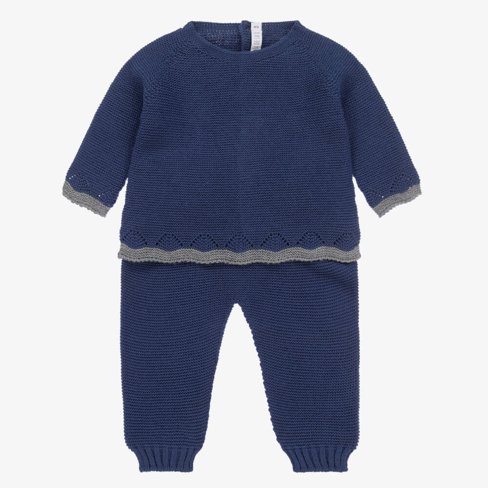Softly knitted trouser set for baby boys by Paloma de la O, in a deep shade of blue. Trimmed with complementary grey edges, the sweater is designed with openwork detailing and traditional wooden button fastenings on the back. The matching trousers have a stretchy, ribbed waistband and cuffs for comfort and shape