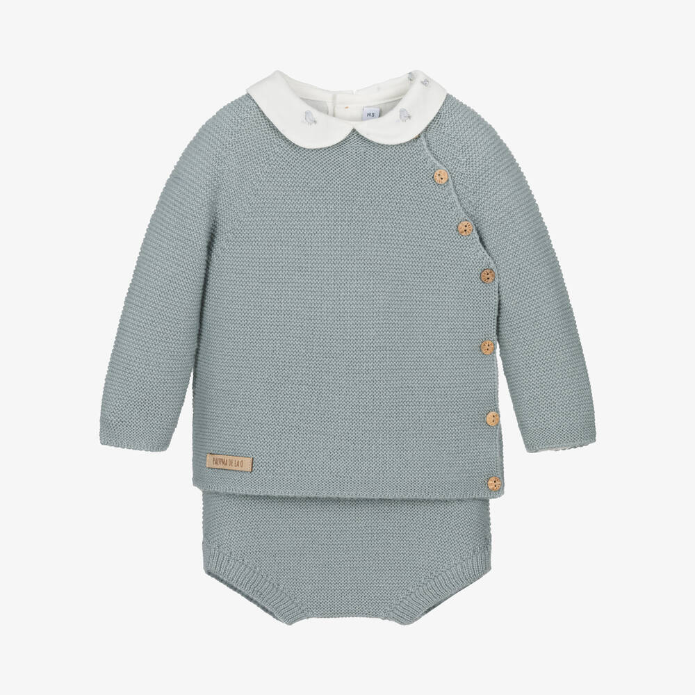 Slate grey shorts set for baby boys by Spanish brand Paloma de la O, knitted in soft Merino wool. The garter stitch sweater has a round neckline and wooden button fastenings down one side of the body. There is a small logo tab stitched on the hem for a designer touch. The matching shorts have a stretchy ribbed waistband for comfortable wear. To create a layered look, the set includes a long-sleeved ivory top made in soft cotton muslin. It has a sweet blue bird print, a Peter Pan collar and button fastenings on the back.