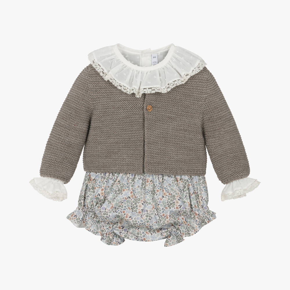 Exclusive to Childrensalon, this dark taupe beige shorts set for baby girls is from Spanish brand Paloma de la O. Made in soft and lightweight cotton, the plumeti blouse comes in an ivory colourway with a lace-trimmed collar and elasticated frill cuffs. Pearlescent buttons fasten neatly on the back. The garter stitch cardigan fastens with wooden buttons on the front and provides an extra layer of warmth in cooler temperatures. A pair of patterned shorts are fully lined and printed with blue and green florals. They have an elasticated, shirred waist and frilly legs for extra comfort.