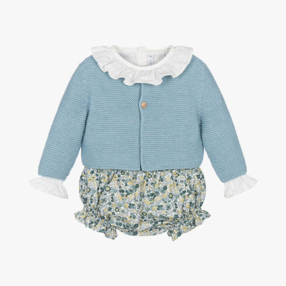 Exclusive to Childrensalon, a traditionally styled cotton shorts set for baby girls by Paloma de la O, in ivory and blue. The lightweight twill blouse has a smart ruffle collar and matching elasticated cuffs, with button fastenings on the back. It pairs with sweet floral print twill shorts in shades of blue and pale chartreuse green. Comfortable to wear, they have a lightweight lining and gently elasticated trims. Completing the set is a softly knitted cardigan in a cosy wool blend. A simple, round neck style, it fastens with branded wooden buttons.